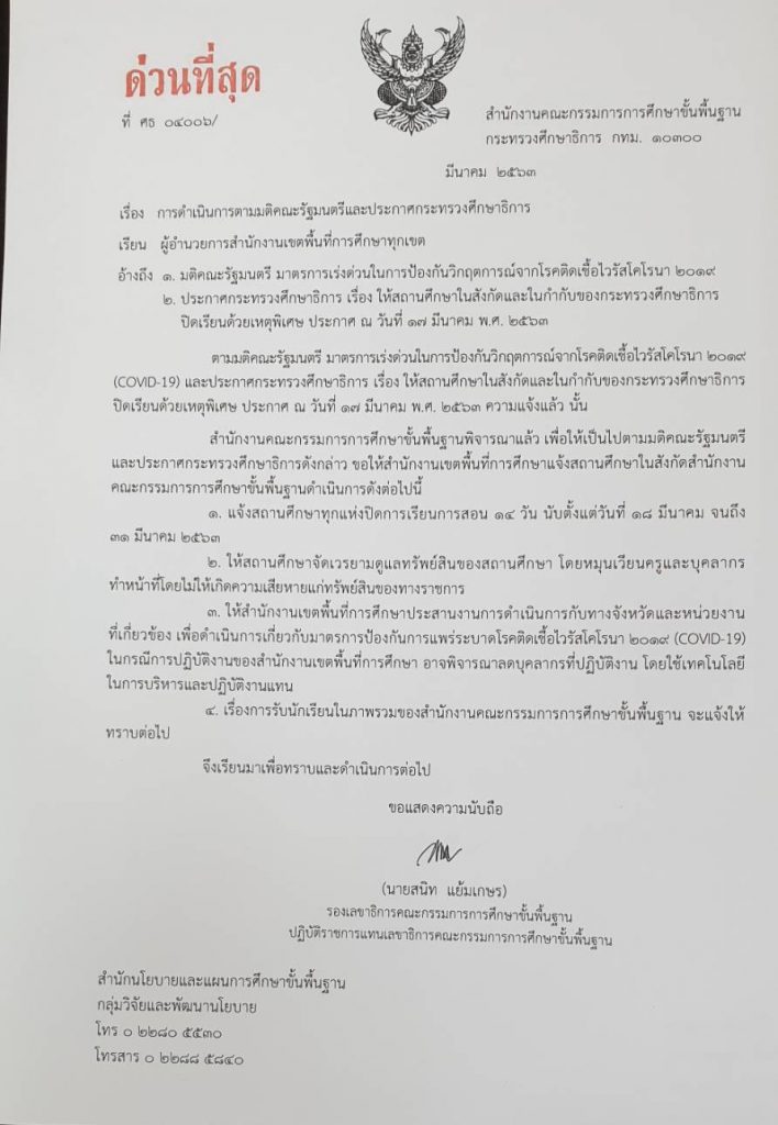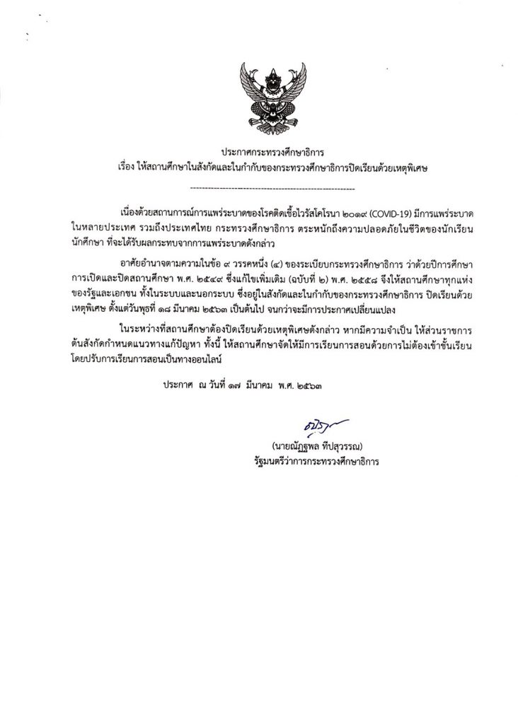 แจ้งปิดโรงเรียน 18-31 มีนาคม 2563