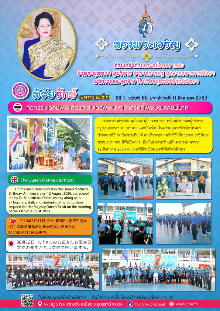 วันอังคารที่ 11 สิงหาคม 2563นายสาส์นลิขิตชัยพลไธสง ผู้อำนวยการฯ พร้อมด้วยคณะผู้บริหาร ครู/บุคลากร และนักเรียน โรงเรียนอุดรพิชัยรักษ์พิทยา ประกอบพิธี”เฉลิมพระเกียรติ สมเด็จพระนางเจ้าสิริกิติ์พระบรมราชินีนาถ พระบรมราชชนนีพันปีหลวง เนื่องในโอกาสวันเฉลิมพระชนมพรรษา 12 สิงหาคม 2563ณ ลานพิธีโรงเรียนอุดรพิชัยรักษ์พิทยา