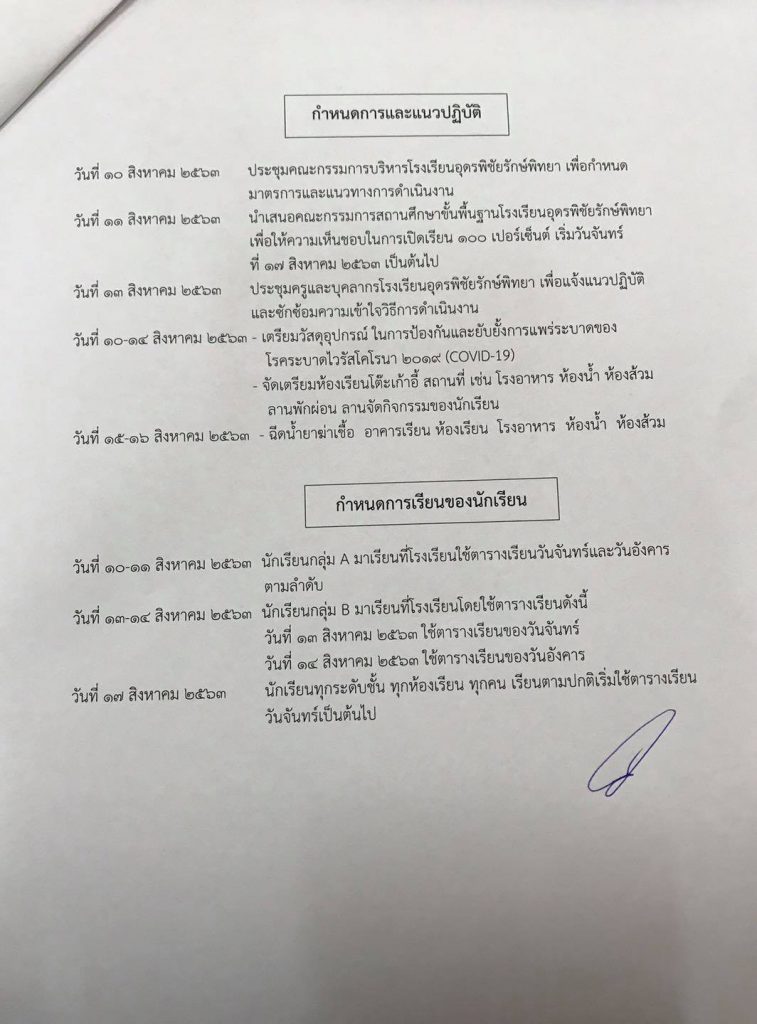 ประกาศเรื่อง การทดลองเปิดเรียน On-site ในสถานการณ์การแพร่ระบาดของโรคติดต่อเชื้อไวรัสโคโรนา 2019 (COVID-19) เต็มรูปแบบแบบ**ในวันที่ 13 – 14 ส.ค. 63 นักเรียนกลุ่ม B เรียนที่โรงเรียนโดยใช้ตารางเรียนดังนี้ วันที่ 13 ส.ค. 63 ใช้ตารางเรียนวันจันทร์ วันที่ 14 ส.ค. 63 ใช้ตารางเรียนวันอังคารวันจันทร์ที่ 17 ส.ค. 63 นักเรียนทุกระดับชั้น ทุกห้อง ทุกคน เรียนตามปกติเริ่มใช้ตารางเรียนวันจันทร์เป็นต้นไปรายละเอียดตามแนบนี้