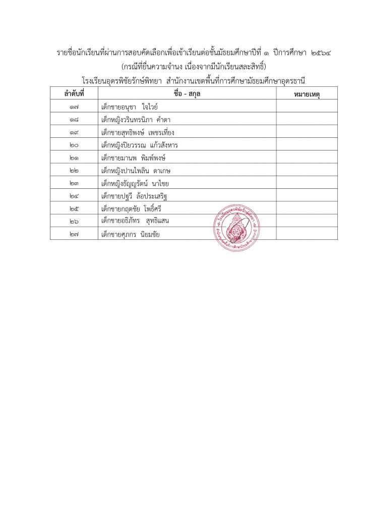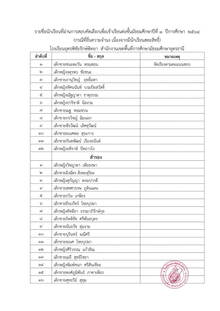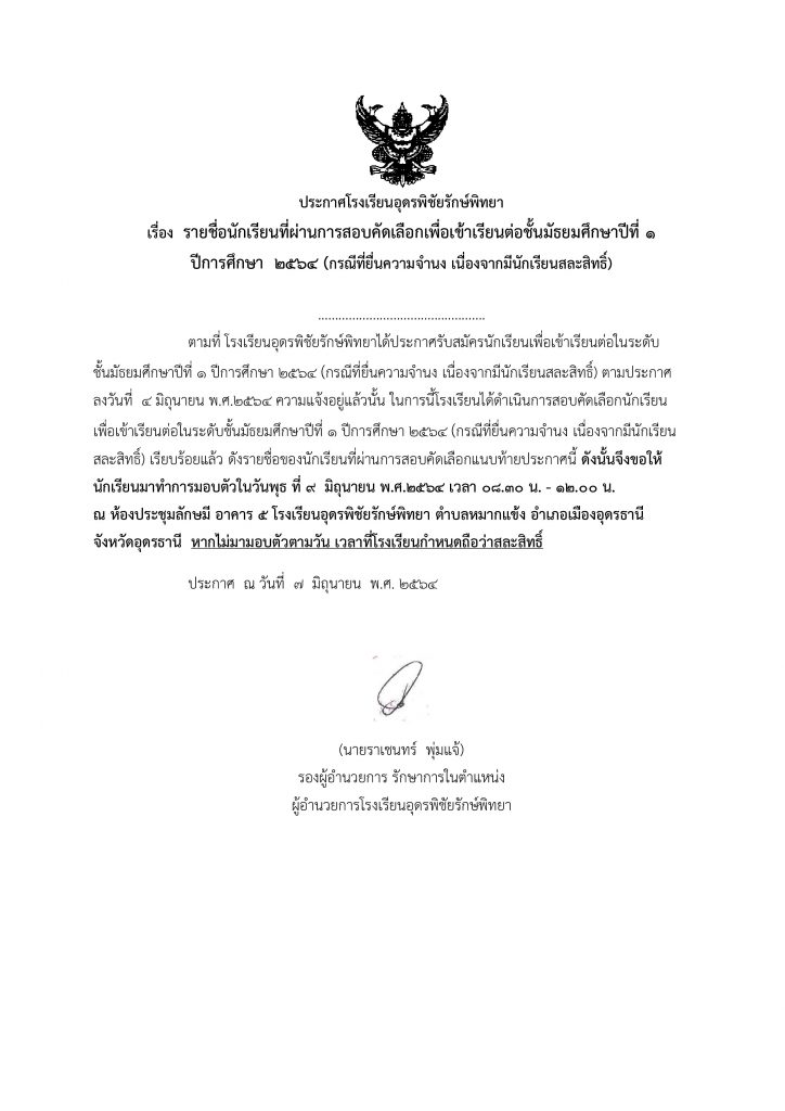 ประกาศ รายชื่อนักเรียนที่ผ่านการสอบคัดเลือกเพื่อเข้าเรียนต่อชั้นมัธยมศึกษาปีที่ 1 ปีการศึกษา 2564 (กรณีที่ยื่นความจำนง เนื่องจากมีนักเรียนสละสิทธิ์)
