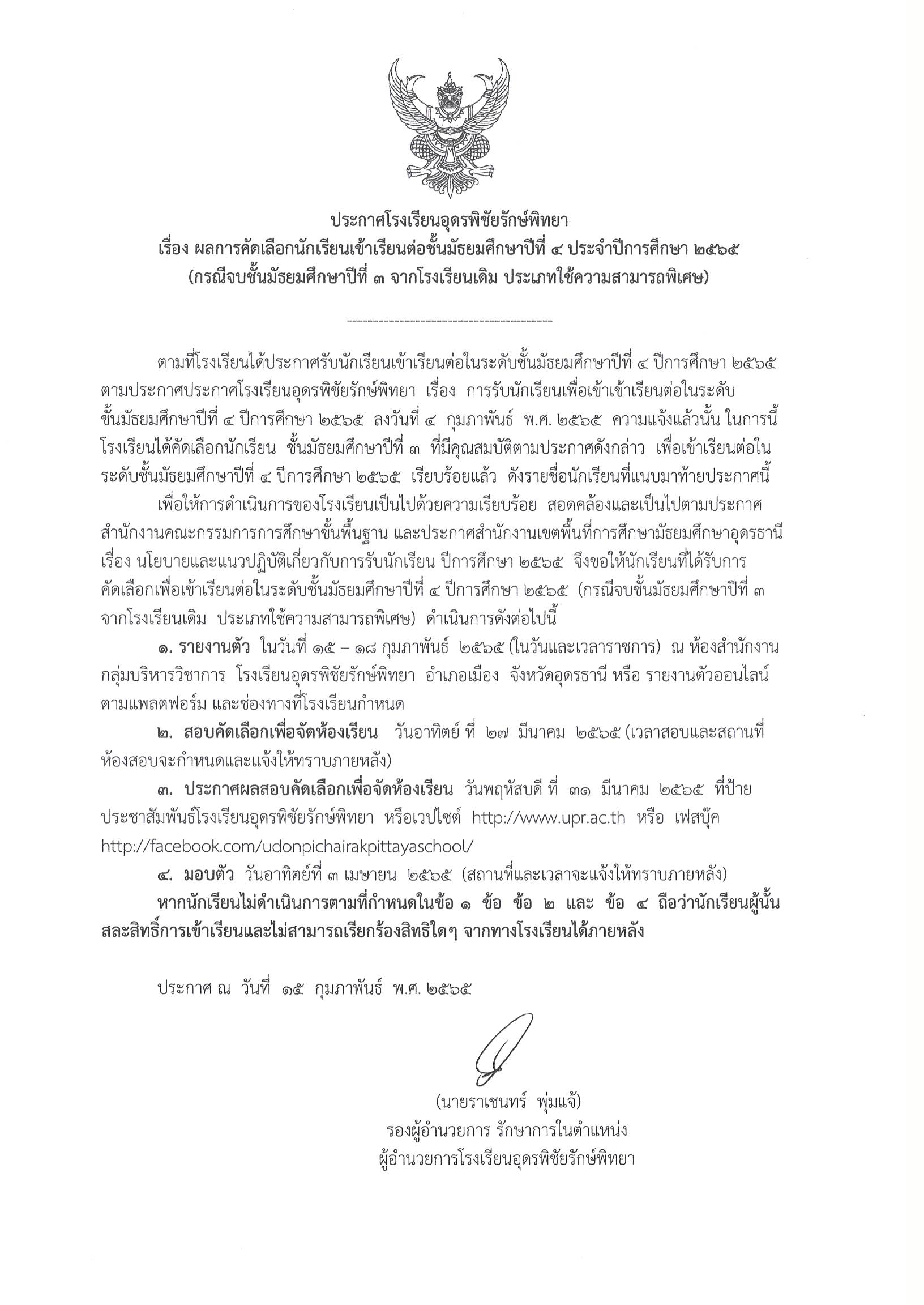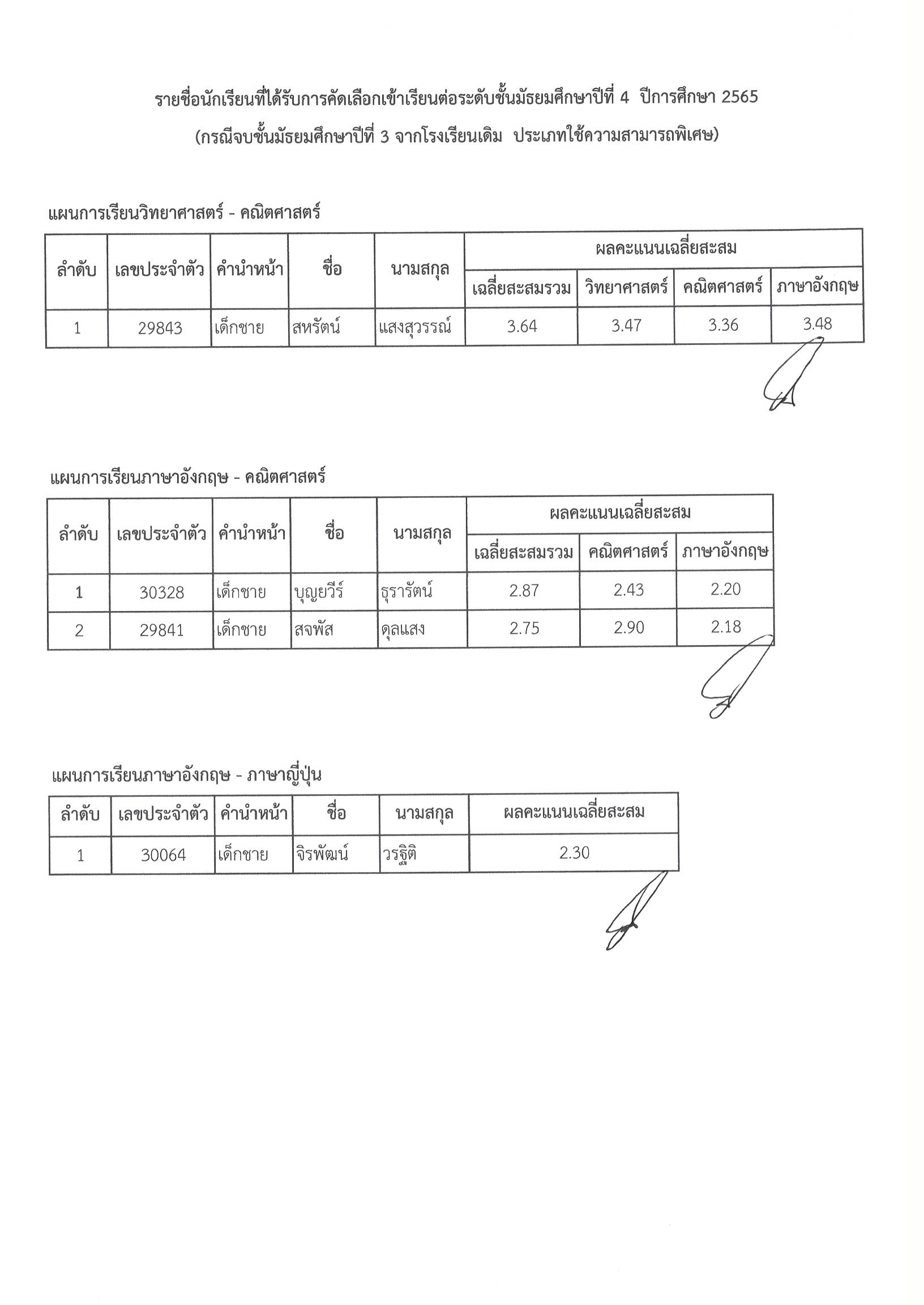 ประกาศผลการคัดเลือกนักเรียนเข้าเรียนต่อชั้นมัธยมศึกษาปีที่ ๔ ประจำปีการศึกษา ๒๕๖๕ (กรณีจบชั้นมัธยมศึกษาปีที่ ๓ จากโรงเรียนเดิม ประเภทใช้ความสามารถพิเศษ)