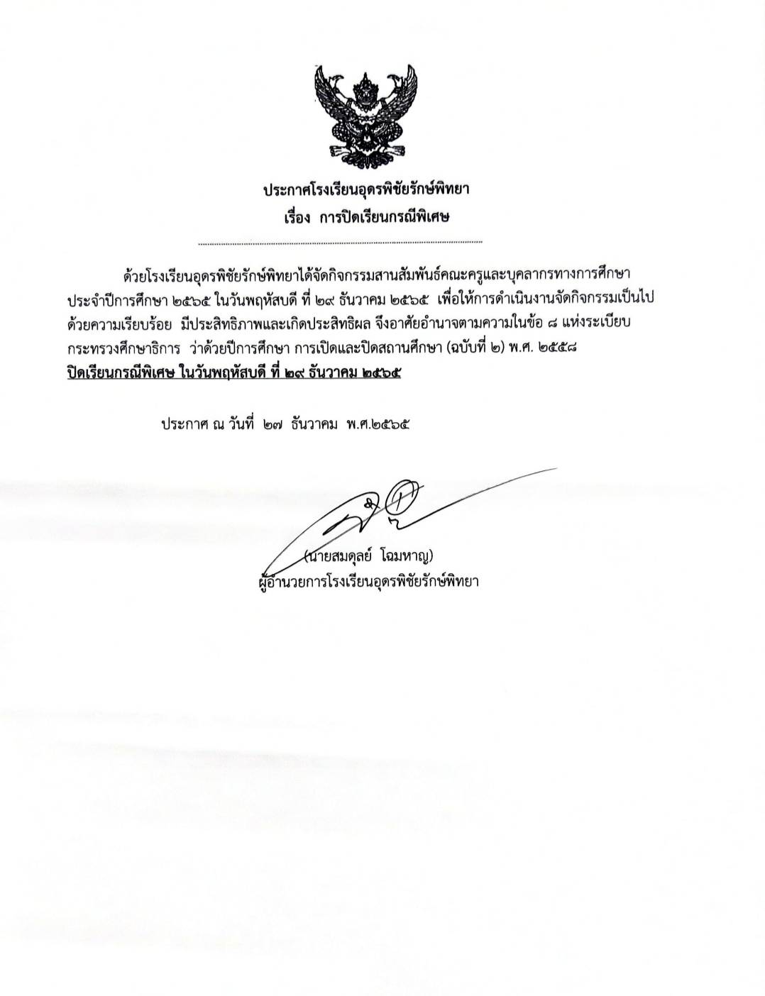 ประกาศปิดเรียนกรณีพิเศษ ในวันที่ 29 ธันวาคม 2565 – โรงเรียนอุดพิชัยรักษ์พิทยา Udonpichairakpittaya School