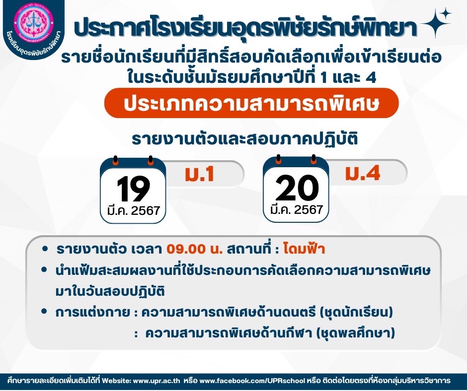 ประกาศรายชื่อนักเรียนที่มีสิทธิ์สอบคัดเลือกเพื่อเข้าเรียนต่อในระดับชั้น ม.1 ประเภทความสามารถพิเศษ