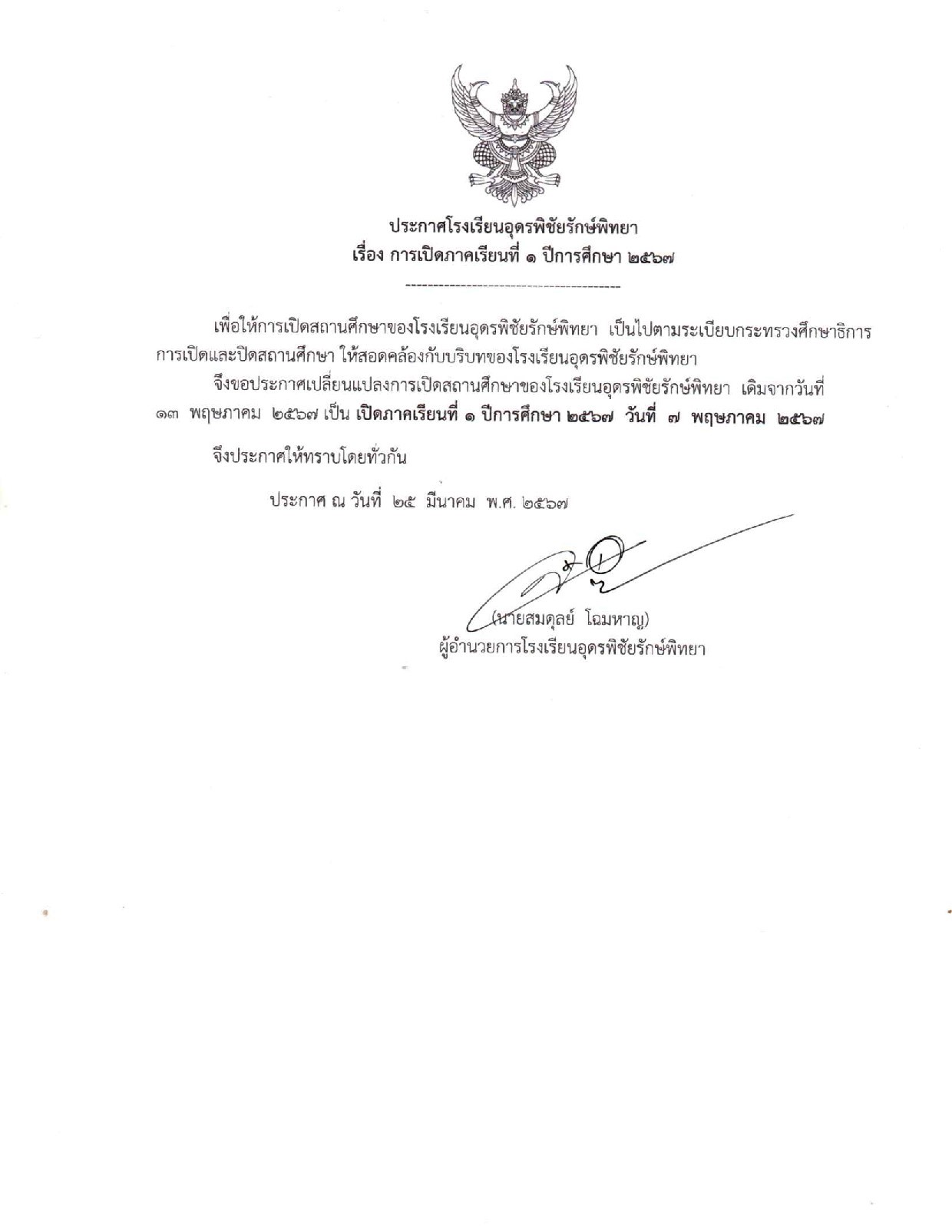 ประกาศ การเปิดภาคเรียนที่ 1 ปีการศึกษา 2567 – โรงเรียนอุดพิชัยรักษ์พิทยา Udonpichairakpittaya School