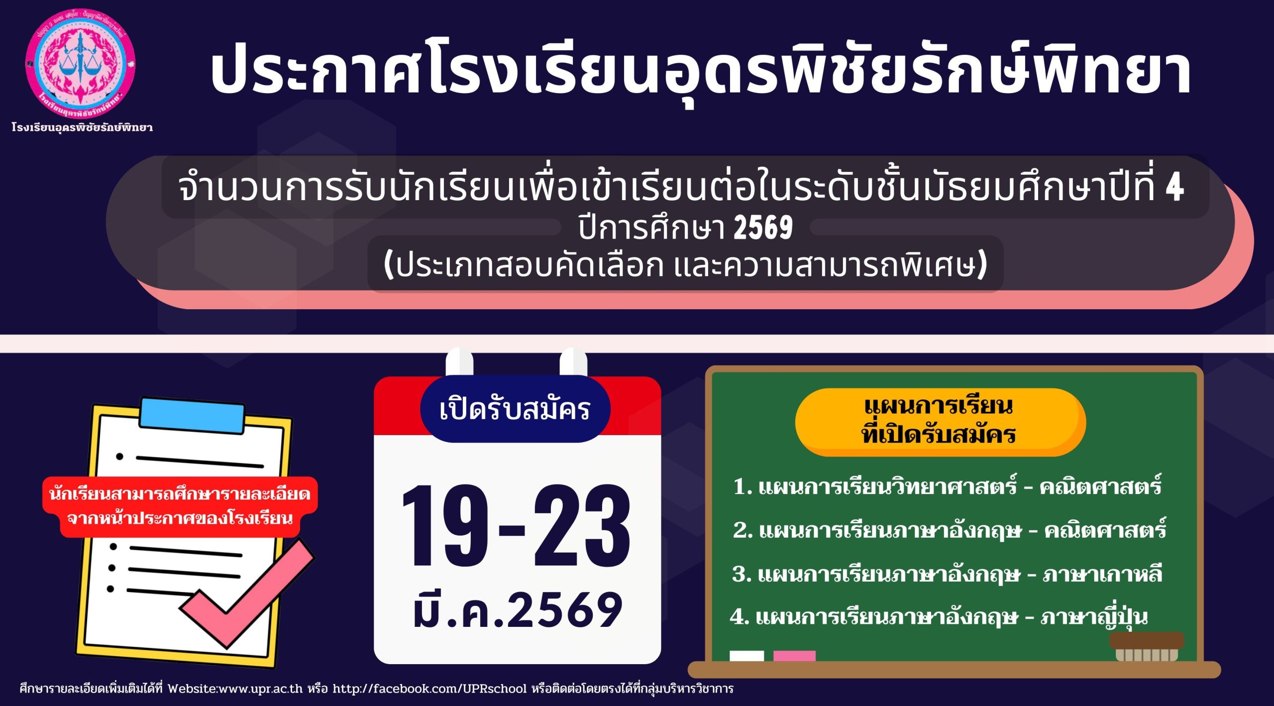 ประกาศจำนวนการรับนักเรียนเพื่อเข้าเรียนต่อในระดับชั้นมัธยมศึกษาปีที่ 4 ปีการศึกษา 2569 (ประเภทสอบคัดเลือก และความสามารถพิเศษ) – โรงเรียนอุดพิชัยรักษ์พิทยา Udonpichairakpittaya School