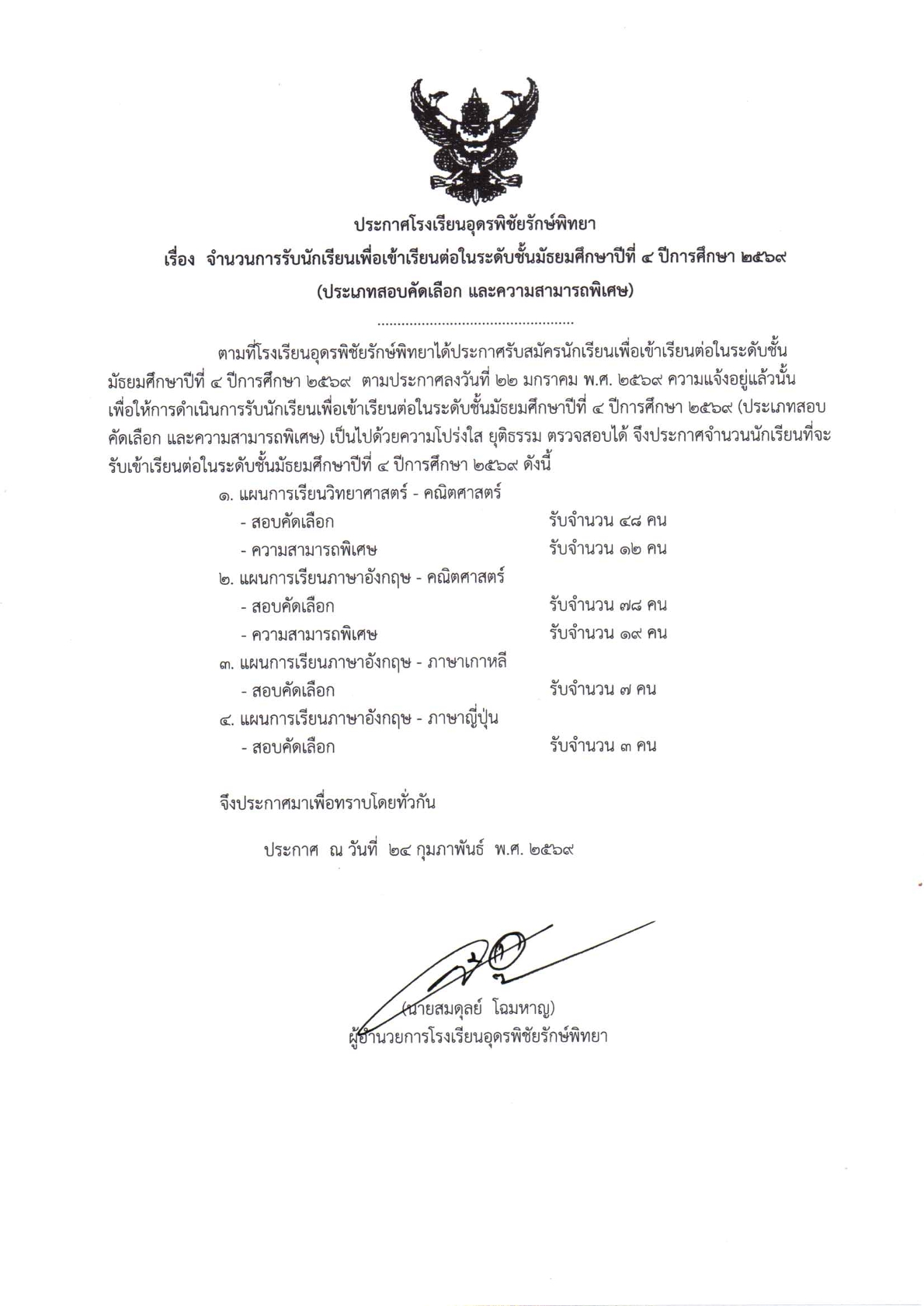 ประกาศจำนวนการรับนักเรียนเพื่อเข้าเรียนต่อในระดับชั้นมัธยมศึกษาปีที่ 4 ปีการศึกษา 2569 (ประเภทสอบคัดเลือก และความสามารถพิเศษ)